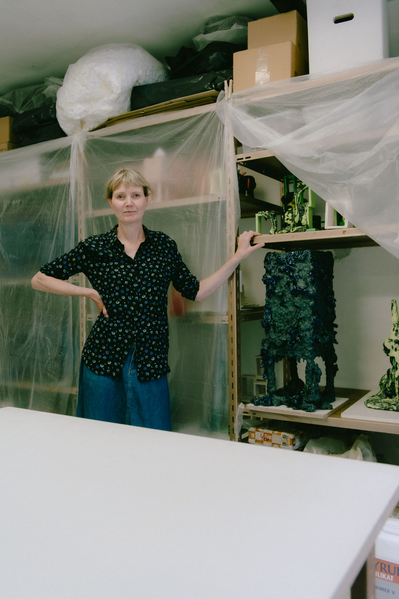When Gitte Jungersen opened the door to her studio - which she refers to as her “cave” - in September 2021 - she first appeared cautious, almost shy, speaking in such a soft, measured tone, that I remember modulating my own voice, mirroring her, as if not to disrupt the required atmosphere. As she walked me through her basement level studio, located in Østerbro, Copenhagen, she spoke about the importance of “hiding” and “finding solitude” in order to work. I suspected at this moment that studio visits were something she rarely welcomed. As I looked between her and the work, I felt an impatience to understand the impulse behind it, how these eruptions on the shelves could coexist with the composed presence beside me.