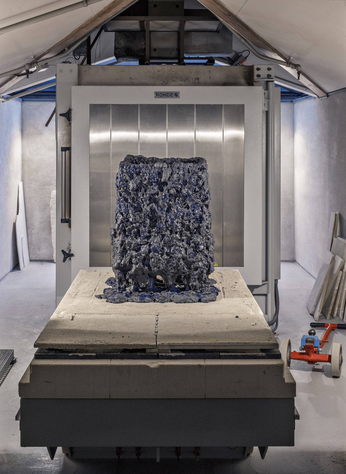 This restrained and deliberate framework is necessary so she can push it to the edge without it turning into a formless mass. The greater the upheaval she invites, the firmer the scaffolding beneath it. Her work lives in that tension, between control and chaos, geometry and dissolution, intention and everything that lives outside it. From there, the kiln introduces its own forces, and at that point she must finally surrender, and let go.