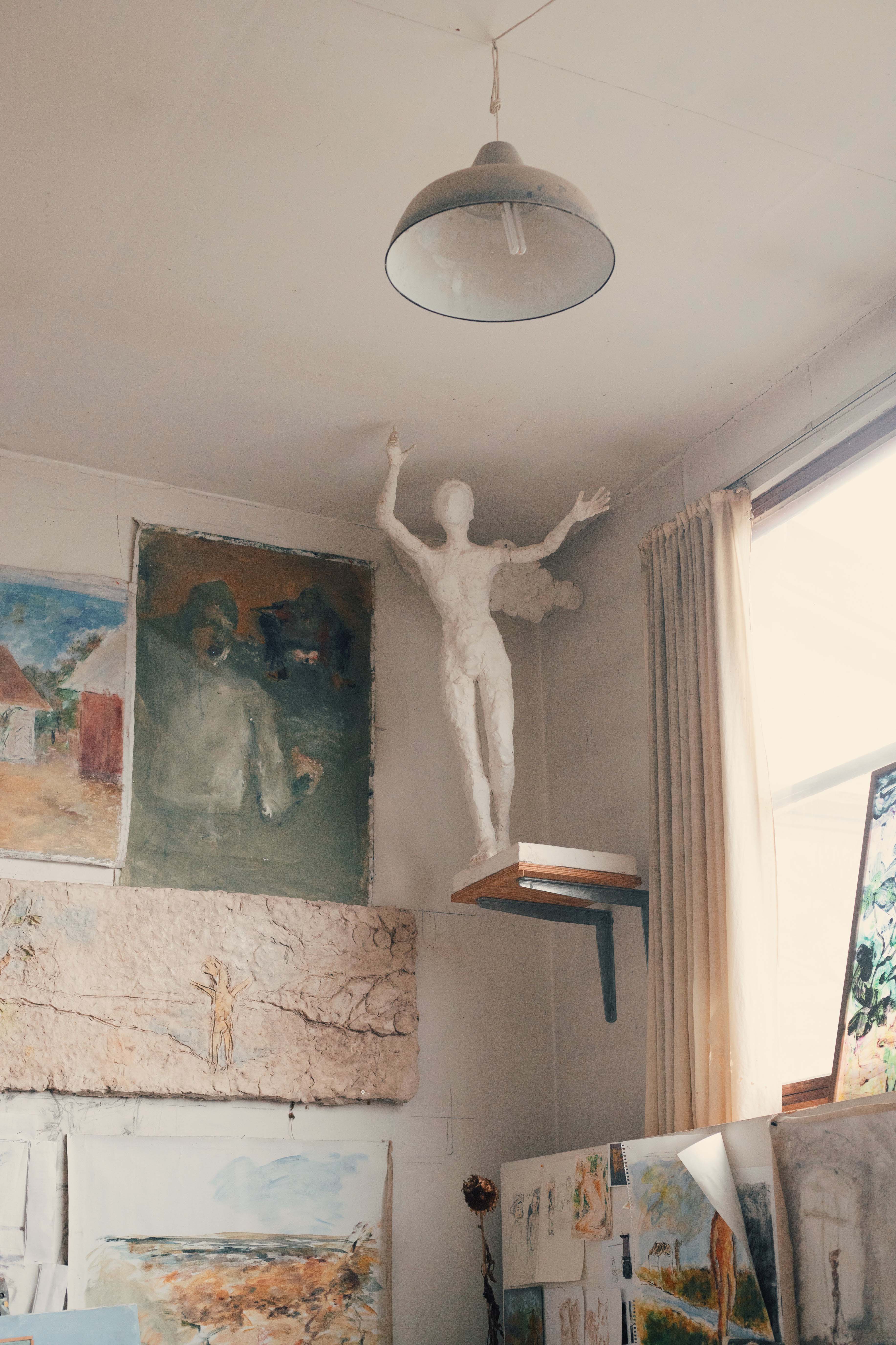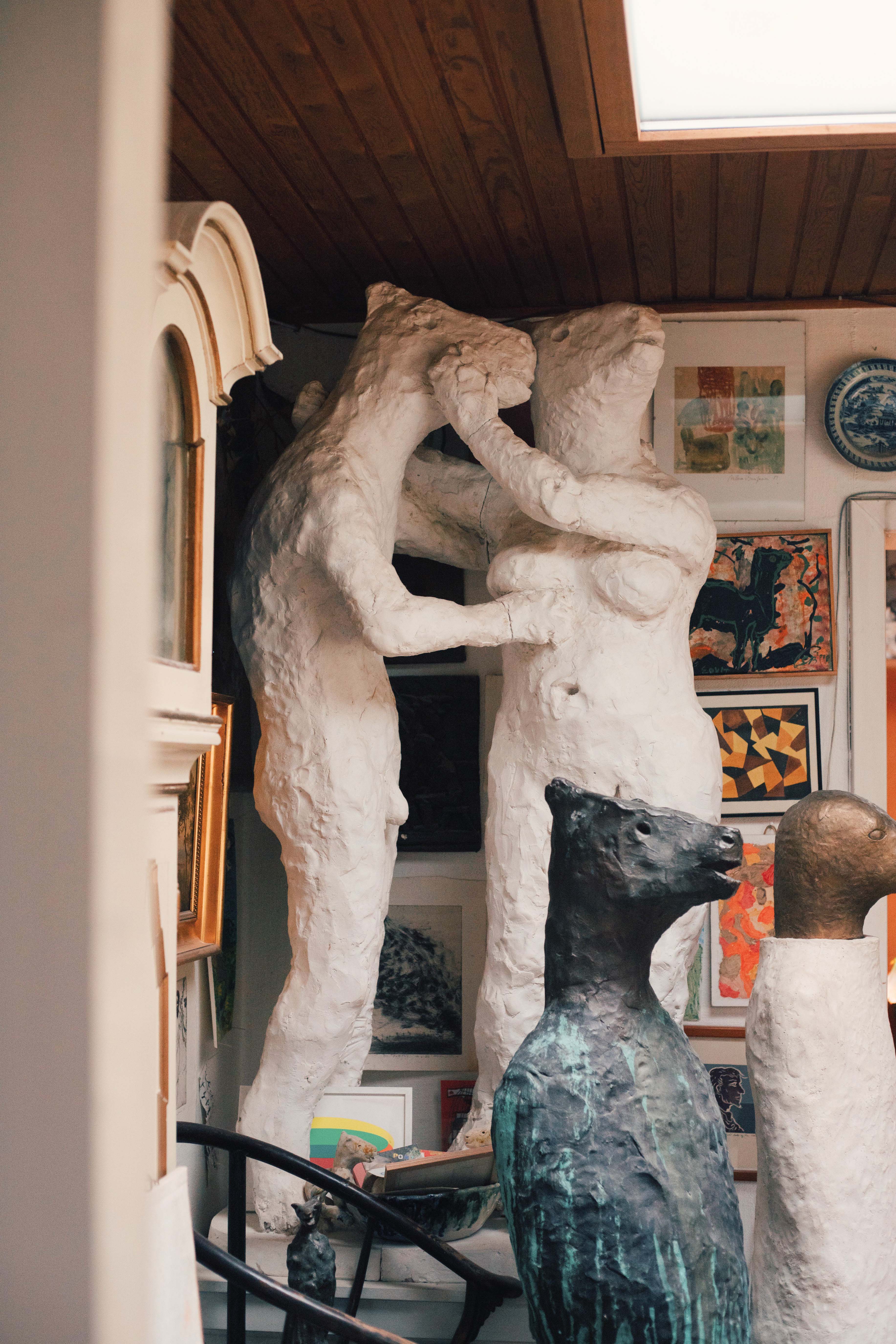As I walk in, Pontus is laying on the couch, legs straight out with his laptop on his thighs: “I just need to finish this email and I will be with you.” Right behind him are two more, human-scale sculptures of two beings, one with wings holding another without wings that seems to be fainting, or falling. They’re by Pontus, made originally for an exhibition in 2017, “Down with the Arms—The Landscape of Life” at Rudolph Tegners Museum.