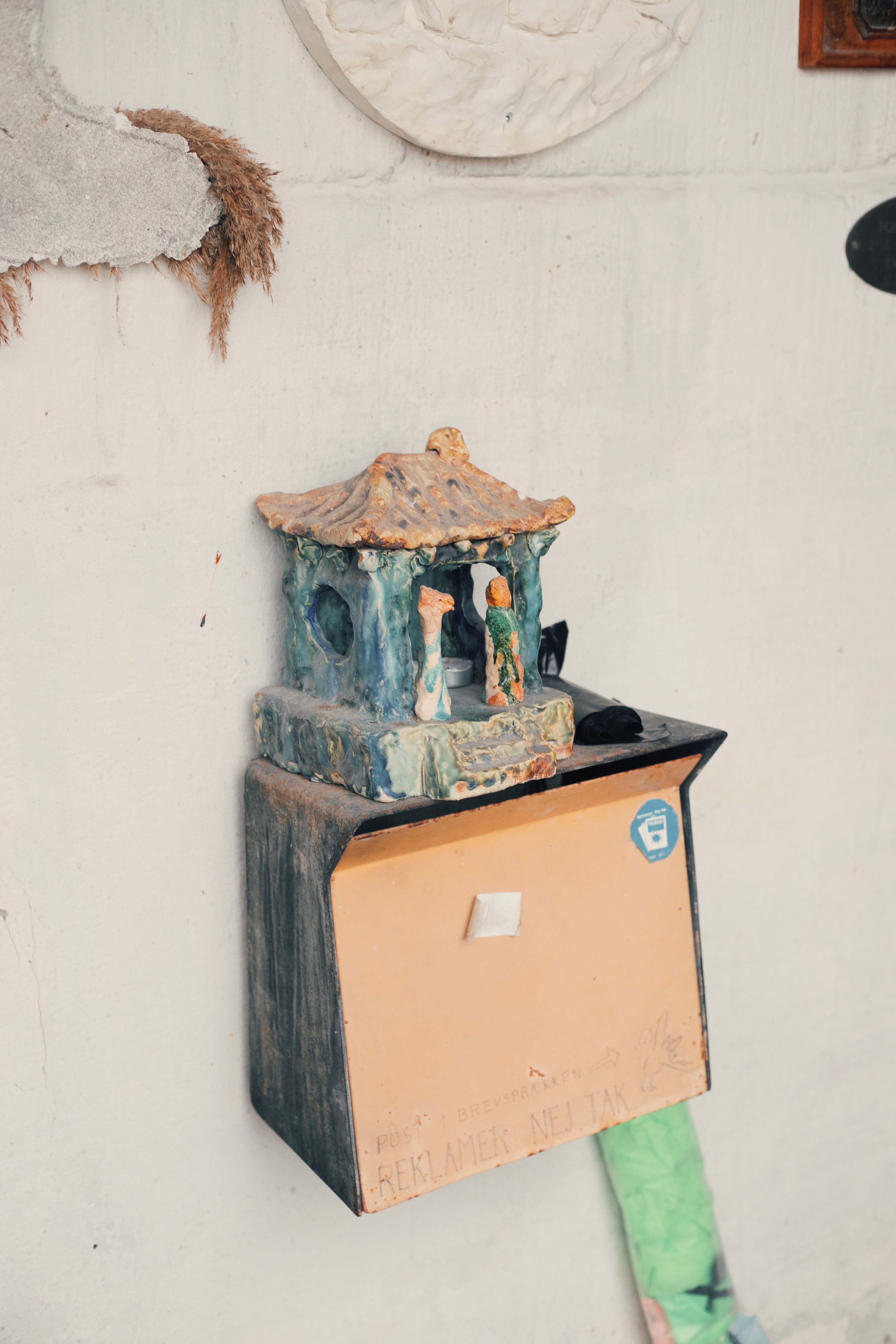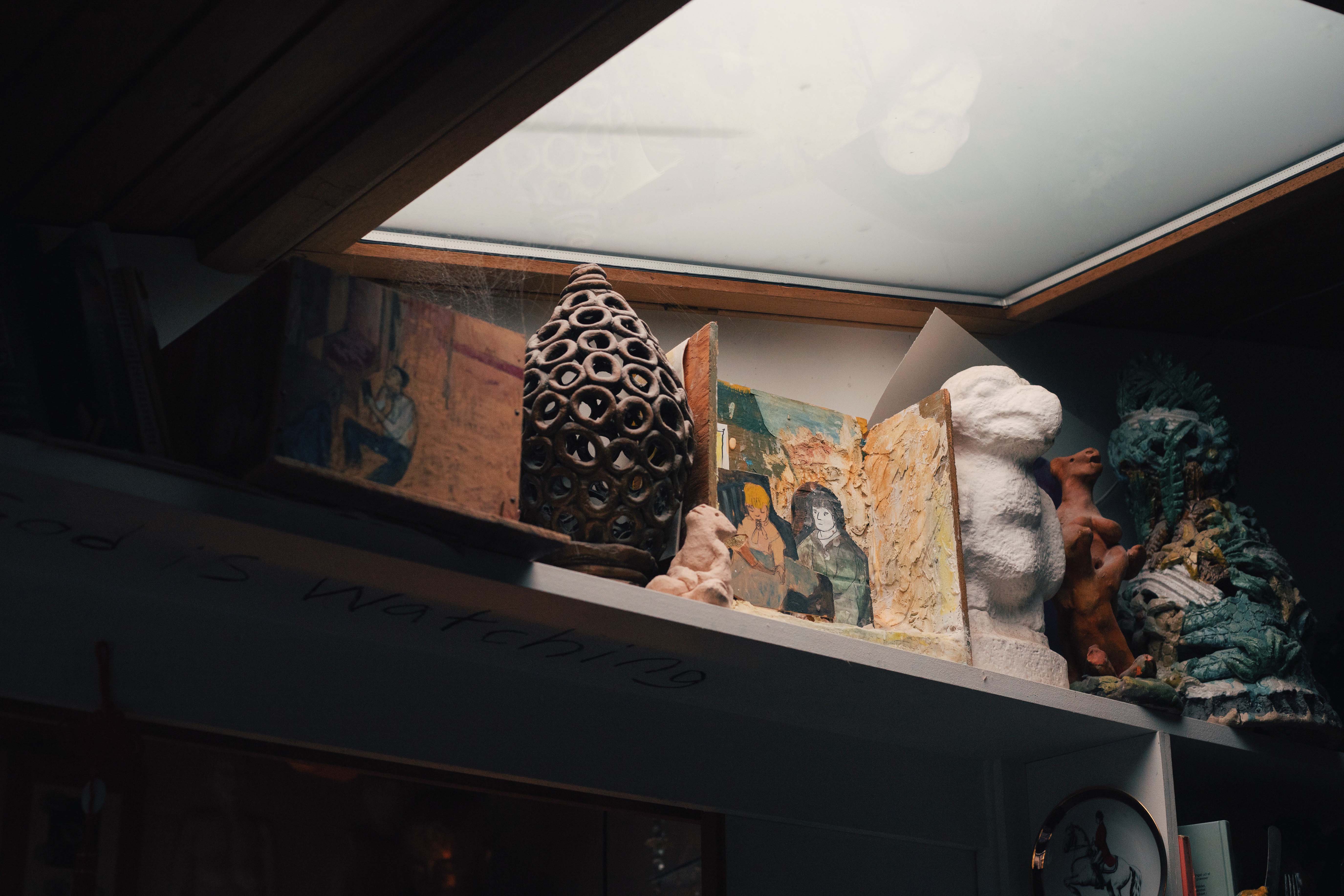 By the time we make it to their front door, I’ve registered at least another 10 works; mosaic tiles leading to the entrance of their home, a plaster relief, a custom letter box, to a sign that looks like it’s made of chipboard, right above Tine’s studio door that says “The smile you send out, returns to you.” This sets a mood that continues into their home.