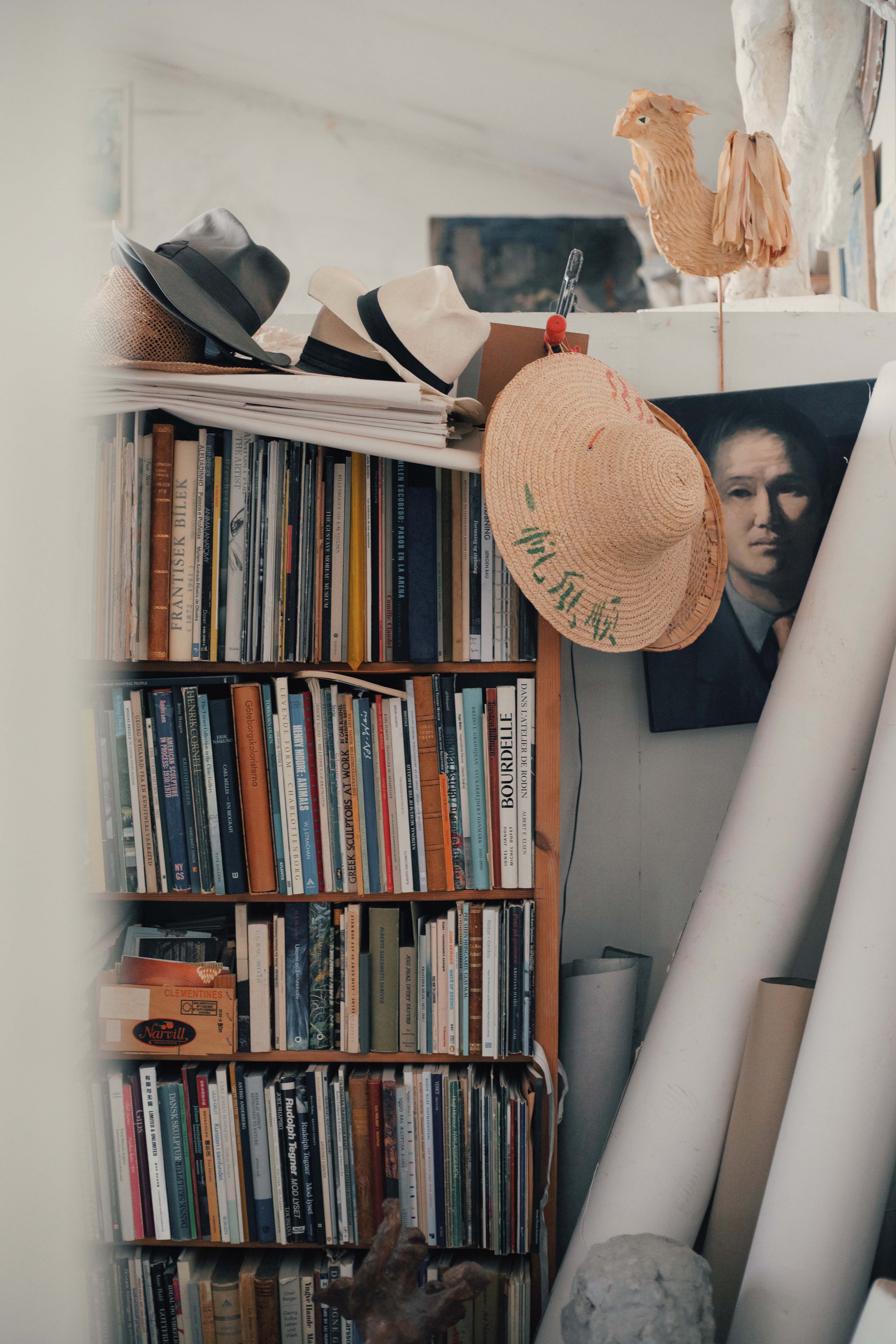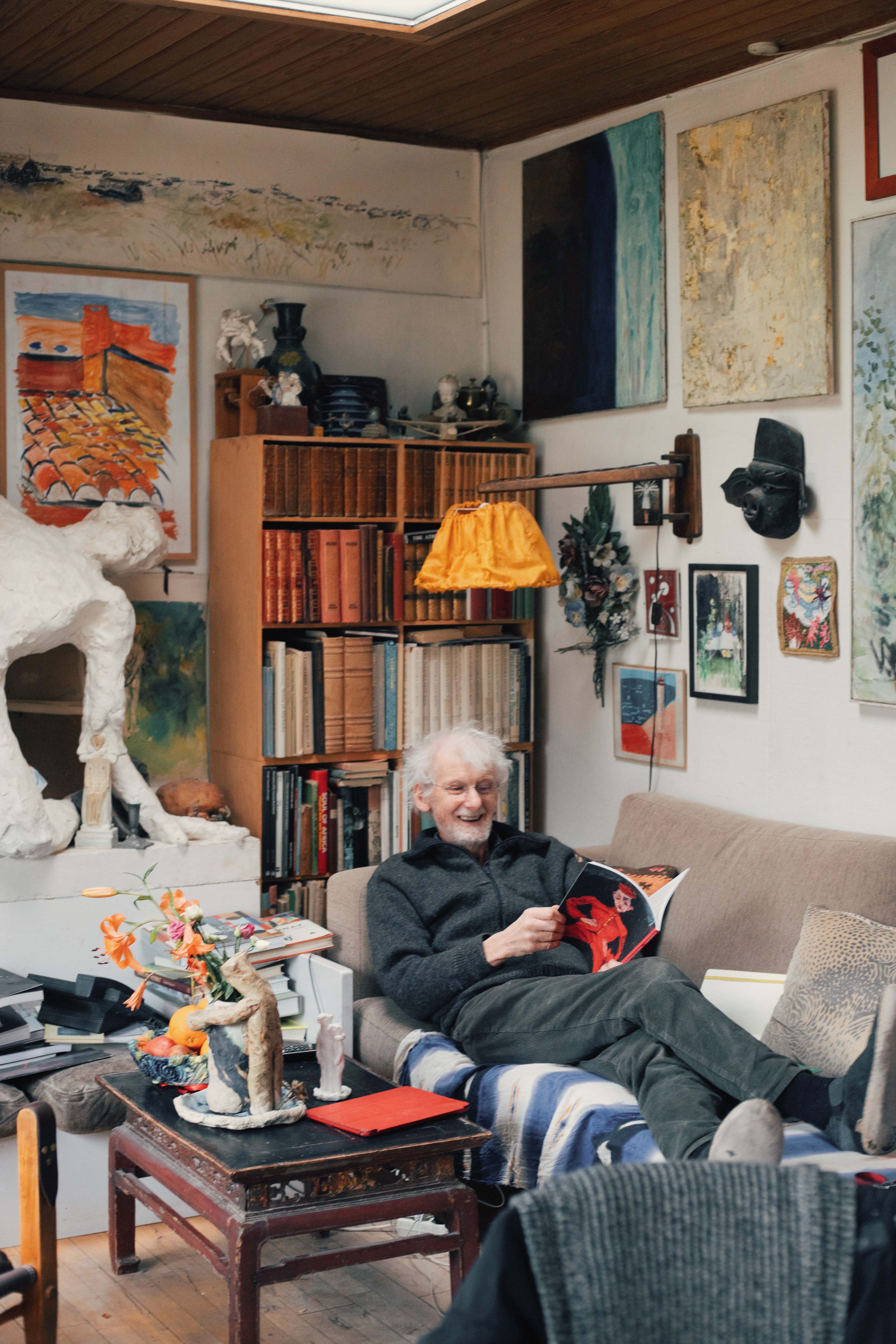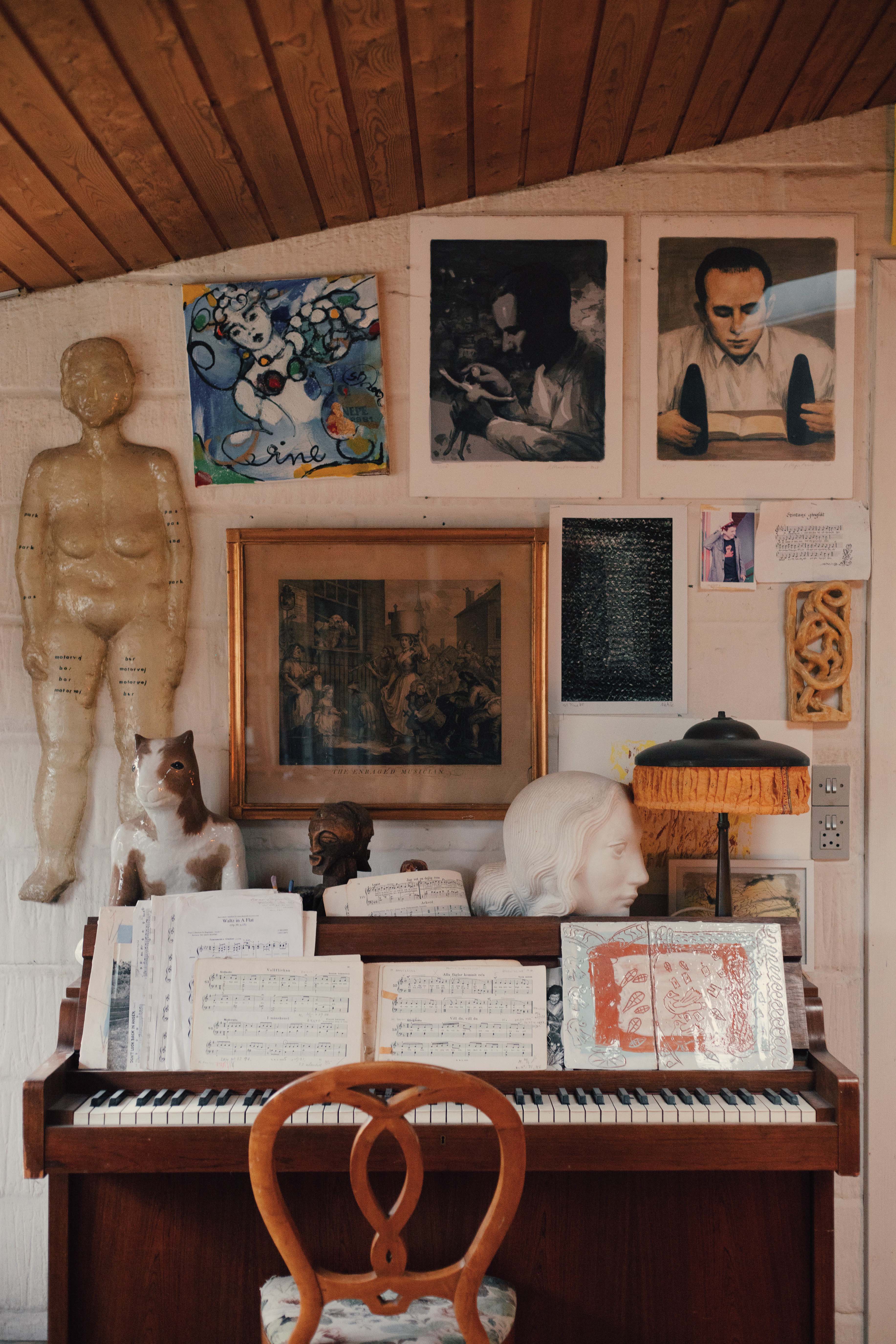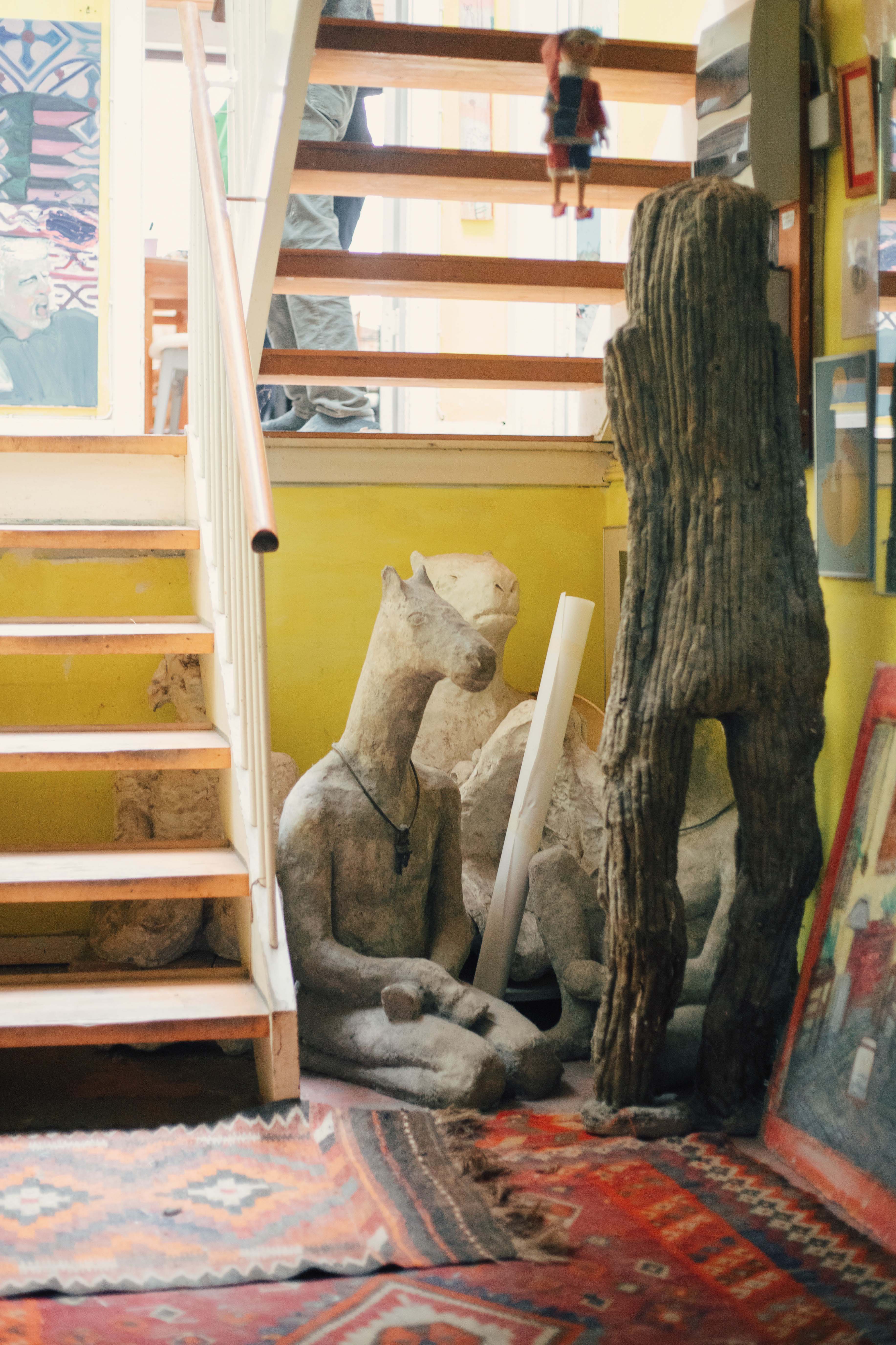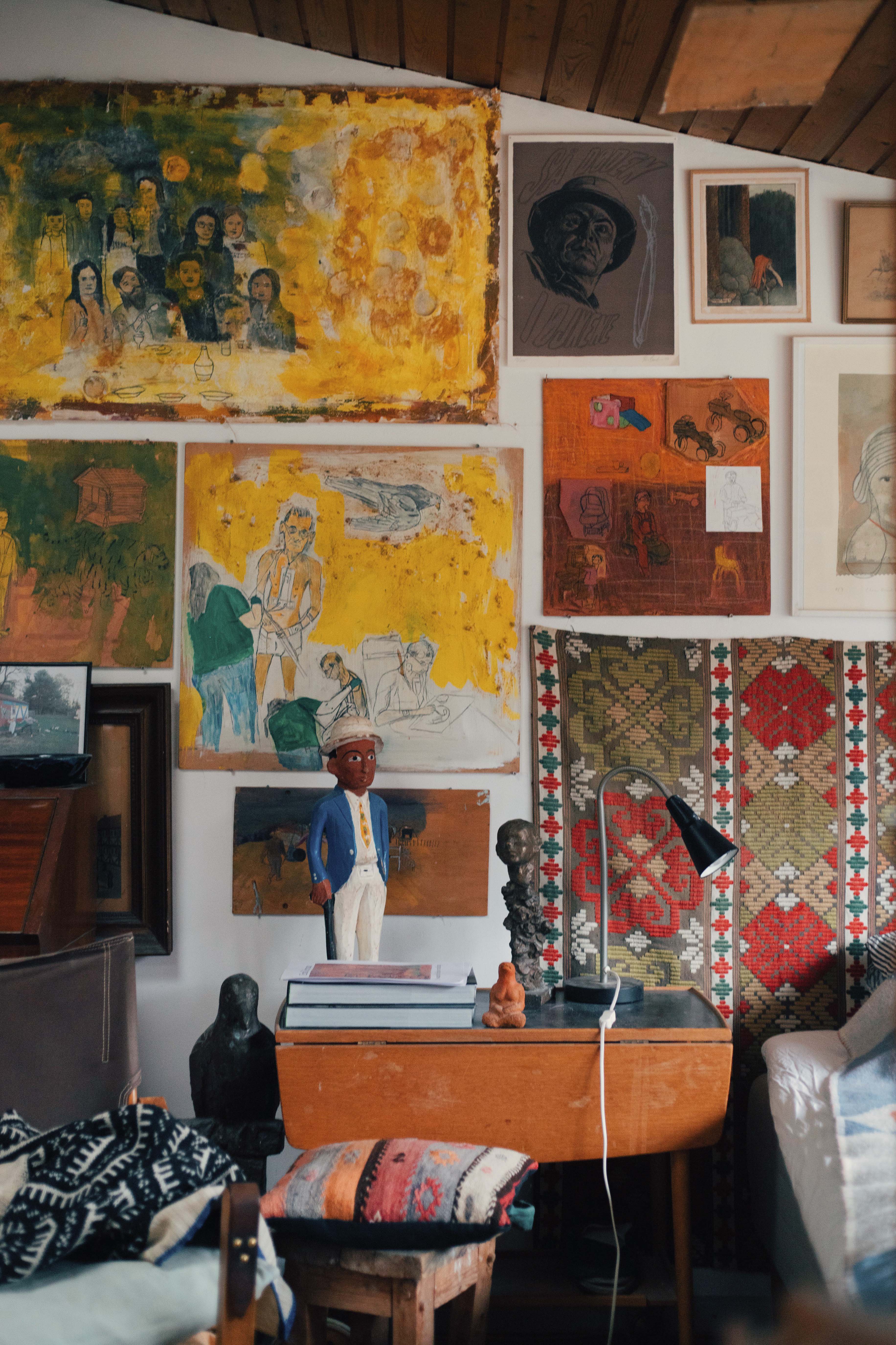 Their home can only be described as full, almost bursting. Bursting with such a fullness and energy you can almost feel a heartbeat in every corner. Like a newborn cooing with the joys and wonders of all that’s unfolding, I’m finding it difficult to keep in the involuntary sounds humming and slipping out of my mouth. Immediately taken by the chartreuse colored entry way, four human sized fantastical creatures—three sitting, one standing—congregate under the stairs to welcome visitors. Paintings are hung at every available height on the walls, from the very base, to the 4-meter high crease of Pontus’s studio where wall meets ceiling. Old exhibition posters taped to doorways, newspaper clippings pinned to any free wall space. All paired with the morning radio and the smell of freshly baked bread made by Pontus, and a rhubarb pie made by Tine fresh out of the oven. I imagine loneliness wouldn’t stand a chance here.