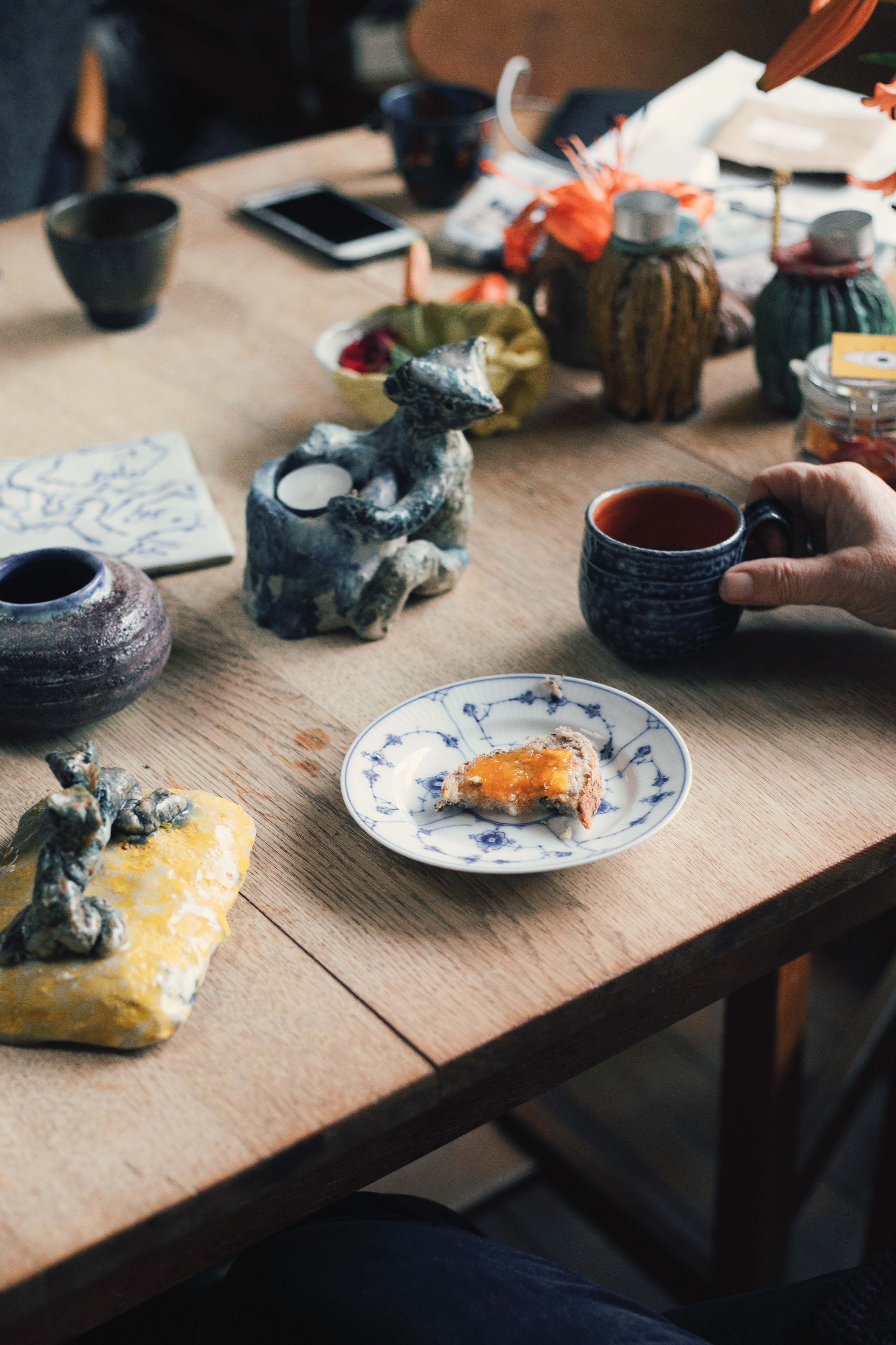 No matter where you are, inside or outside, you’ll either see or be touching their work. From the butter dish to the milk jug, to their bathroom sink, all made by Pontus. Lamps, coasters, the shower tiles, made by Tine. “You start with some things, and then get interrupted… and then whiiirrrr” Pontus trails off with the whirring sound of a stunt plane spiraling. He’s talking about his process. How he jumps from piece to piece, never making one thing at a time.