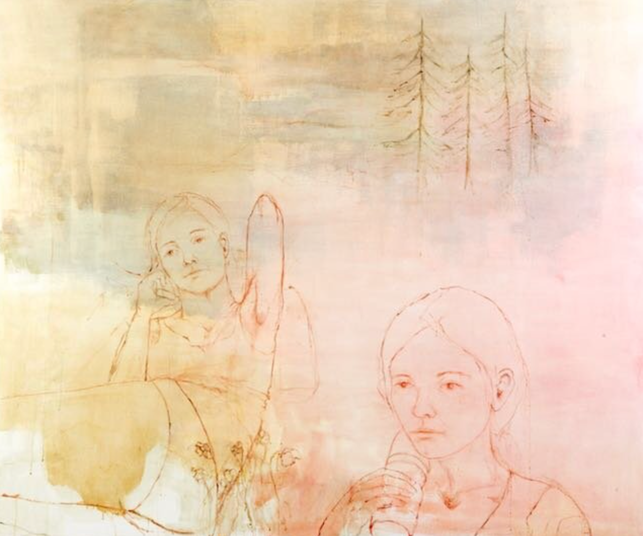 Soften Your Eyes comprised a total of eight pieces painted at a scale of 60 x 70 inches. All pieces were sold except one, Tine didn’t want to let it go. That piece is called Beabel and/or Isatrice, compositions of two girls originally drawn from snapshots of her two daughters on vacation. “Are these two girls sitting together in this frame? Do they know each other? Is someone thinking of them both at the same time? It’s much more about what is going on in people’s minds and how we meet ourselves everyday, and have our own stories and realities.”
