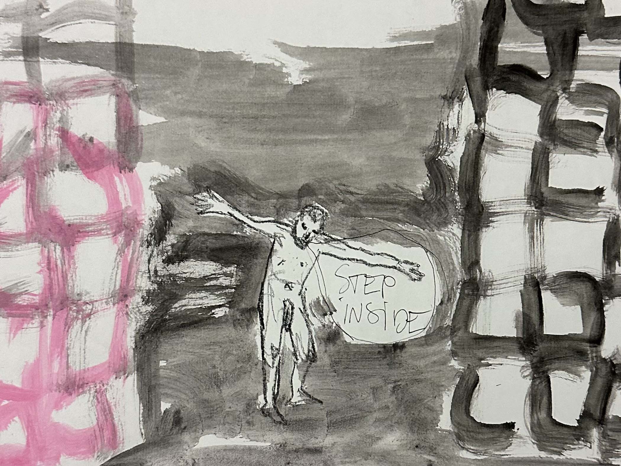 Four years later, in the year 2000, Tine completed her series, From Pink to Scarlett, developed at age 39. Her daughter’s - Dida and Flora’s - favorite period of work. Looking at it now, Tine sees this work as “Brave attempts to express an inbetween nature of people and events… not unlike a visual diary.” Unlike her work now, where stories are more veiled, these are overt and direct: One piece of a naked man standing before two large gates with a speech bubble reading “Step Inside,” another of a woman laying naked, giving birth under a tree. “When my daughters see these they want me to return to that time — where there were words, more energy, more play...” Tine pauses, “But to repaint in that style would be to return to a version of myself that seems much younger, one I’ve since lost — but, I believe, with time, I’ll find my way back to."