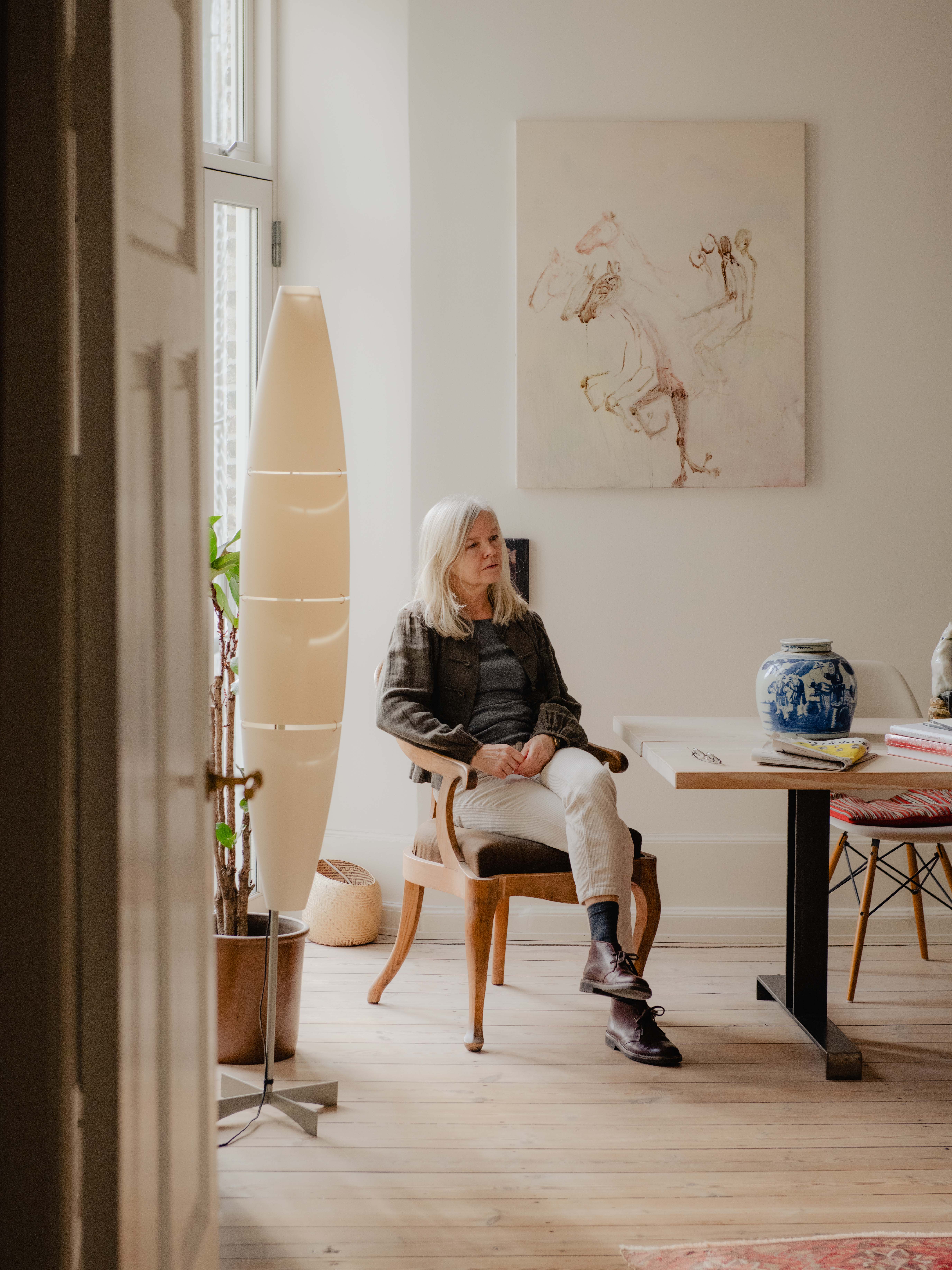 Inside Tine’s home is an atmosphere that feels both peaceful and precise — a space with a temperament of its own, not unlike the sensation of walking into a library. You instinctively lower your voice. “May I take your coat?” Tine asked as I stepped in. Even my damp jacket was swiftly absorbed into the order of the room — no clutter, no fuss, just a quiet sense that everything had its place. That same sense of calm and restraint moves gently through her work — Stand in front of one of her large-scale pieces long enough and I am convinced your heart will begin to beat a little slower.